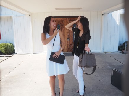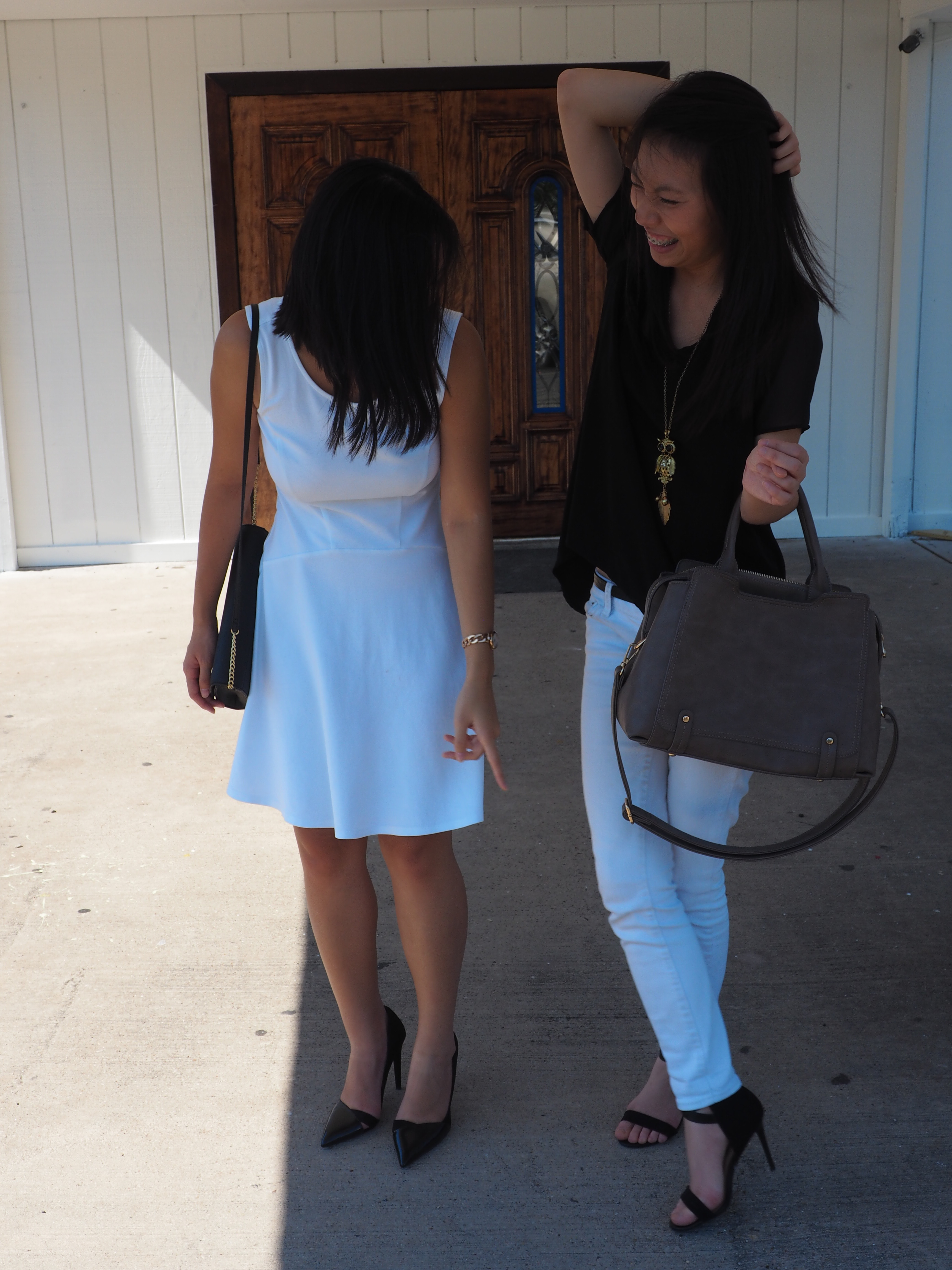 As for my model (who is much more photogenic than I am), her outfit is also much more bargained-for than mine. Her black top, and black heels were bought at Ross when she decided she deserved new clothes for an eventful week at work. The white jeans are from PacSun, which she bought long, long ago. Her owl necklace is from Forever 21, and her pewter structured bag was a gift (and a great one at that).